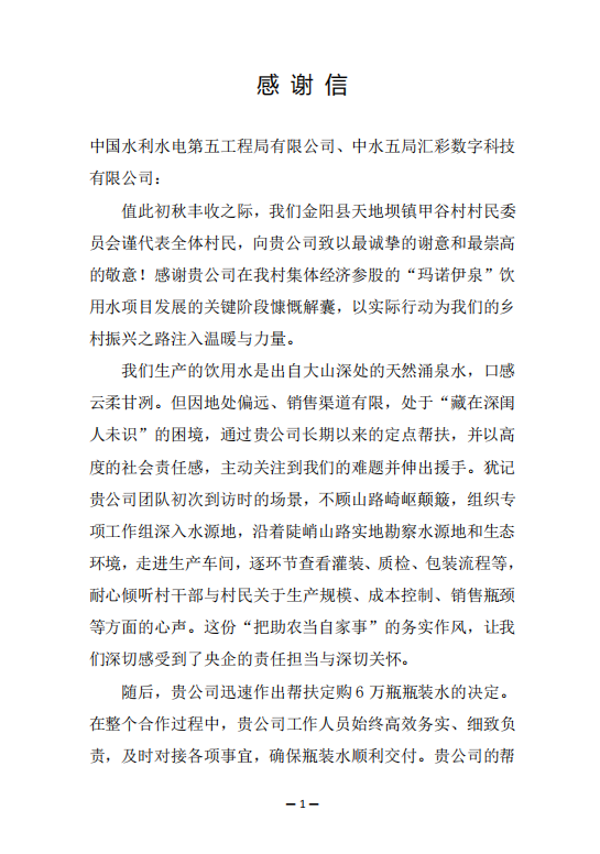 金陽縣天地壩鎮(zhèn)甲谷村村民委員會專門發(fā)來感謝信,對匯彩科技的鼎力支持表示衷心感謝。信中提到,團隊不顧山路崎嶇,深入水源地實地勘察,走進生產(chǎn)車間全程跟進生產(chǎn)流程,并以“把助農(nóng)當自家事”的務實作風,中國水電五局迅速作出定購6萬瓶瓶裝水的幫扶決定,有效緩解了產(chǎn)品滯銷壓力,為項目注入資金支持,極大提振了村民發(fā)展產(chǎn)業(yè)的信心。村委會表示,將把這份支持轉(zhuǎn)化為發(fā)展動力,持續(xù)提升產(chǎn)品品質(zhì)、拓寬銷售渠道,努力讓甲谷村的好水走出大山、走向更廣闊的市場。
